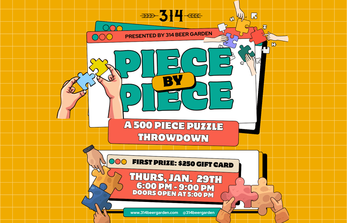 Piece by Piece is taking over 314 for National Puzzle Day on Thursday 1/29/26. Grab your sharpest friends and get ready for a 500-piece puzzle competition where every team gets the exact same puzzle and the clock is very real. Teams are 3–4 players only, with about 1.5–3 hours to finish. Entry is $50 for a team of 3 or $60 for a team of 4, and includes one drink per person because puzzles are better with beverages. Fastest team to finish takes the win. Prizes are no joke: first place scores $250 in gift cards (split between the team), second gets $100, and third takes home $50. Whether you are here to dominate or just aggressively debate edge pieces, […]18:00