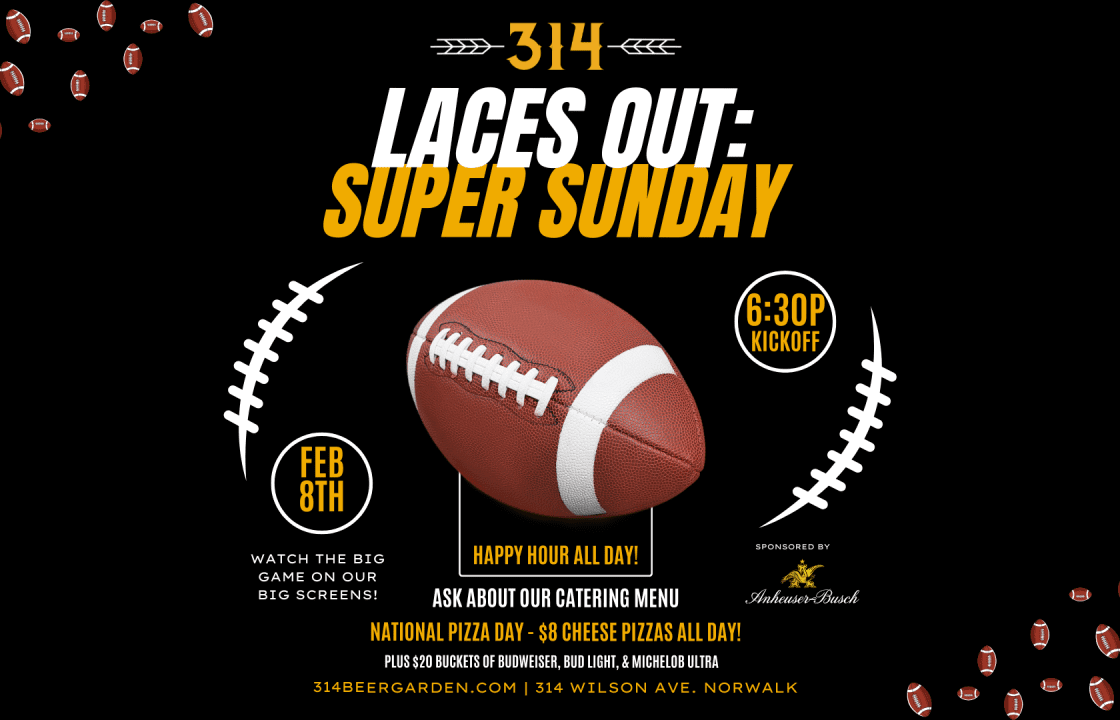 It’s that time of year. The BIG GAME is here. 314 Beer Garden is throwing Laces Out: Super Sunday and you do not want to miss it. Think big screens, rowdy excitement, and deals worthy of the showdown itself. Kickoff: 6:30 pm We’re rolling out happy hour all day, because who doesn’t want great drinks before the first quarter even starts? In honor of National Pizza Day, we’re serving up $8 cheese pizzas all day long (yes, really). Plus, grab $20 buckets of Budweiser, Bud Light, and Michelob Ultra to keep the party rolling. Watch the big game on our giant screens. Whether your team wins or does an Ace Ventura “Alrighty then” recovery in the fourth quarter, we’ve got […]16:00