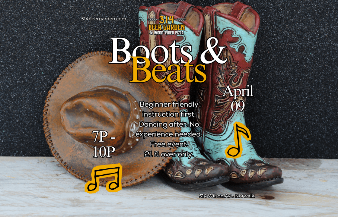 Join us every Wednesday night starting at 7pm for 314 Trivia hosted by Best Trivia Ever. Eat, Drink and Think! Entry is free! Bring your friends – Teams up to 6 players. Winners receive 314 swag, gift cards, or other awesome prizes!Boots & Beats Line Dancing | 314 Beer Garden | Norwalk, CT