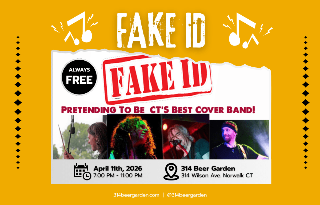 Fake ID Band has been bringing the party to Fairfield County and beyond for years! Enjoy a great mix of party tunes from Dua Lipa to Led Zeppelin, Neil Diamond, Fleetwood Mac, Aretha Franklin, Miley Cyrus, Tom Petty, Grateful Dead, Bruno Mars and all points in between! Featuring Scott Williams on guitar, Stephanie Harrison (also of Moonrise Cartel fame) on the mic, Benj LeFevre (Deep Banana Blackout) and Joe Izzo on the drums. Dance and sing along all night with Fake ID!