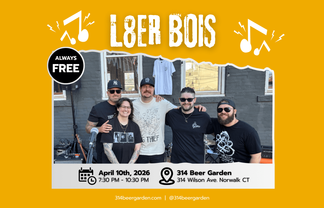 Boots & Beats Line Dancing is taking over the dance floor every second Thursday of the month from 7p–10p. We’ll kick things off with beginner-friendly instruction from Kaylee while Beats by Matt keep the floor moving. Learn the steps, dance it out, repeat all night. No cover. No experience needed. Just show up, grab a drink, and jump in when you’re ready.L8er Bois | Live at 314 Beer Garden | Live Music Norwalk