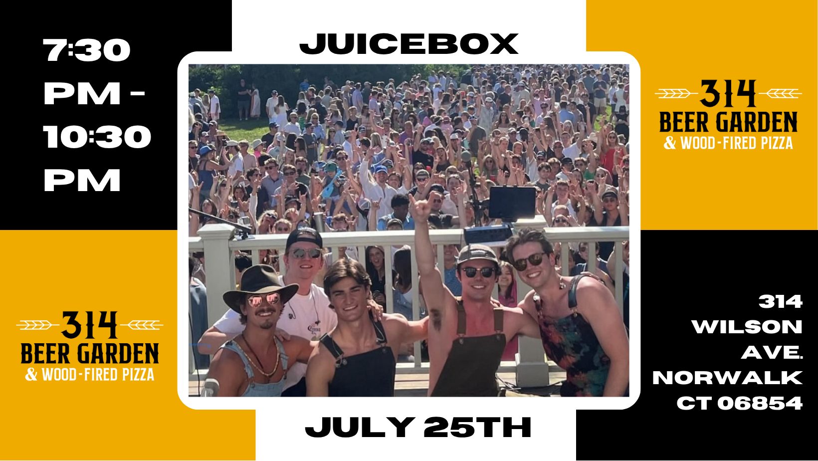 JuiceBox – Forrest Close [vocals, guitar], Trevor McGee [vocals, guitar], Cameron Lawrence [bass], Bo Zeigler [keys], Ben Jachimczyk [drums] is a collaboration of friends and musicians from Norwalk, Connecticut. JuiceBox is a five piece indie-rock, and cover band that isn’t afraid to try something new. With inspiration from old and new bands, JuiceBox brings the energy and will make you groove!