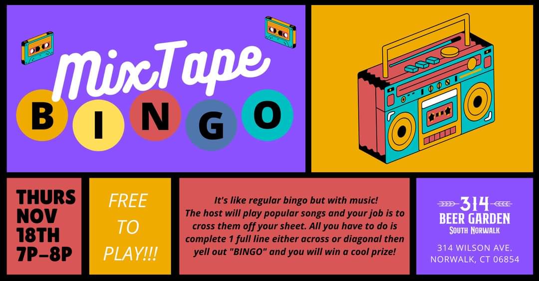 MixTape Bingo is just like regular bingo but with music! The host will play popular songs and your job is to cross them off your sheet. All you have to do is complete 1 full line either across or diagonal then yell out “BINGO” and you will win a cool prize!